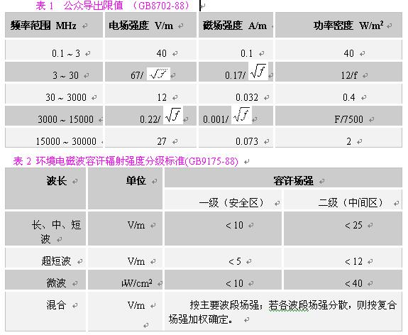 在对一般环境的电磁辐射分析中,应主要选用《环境电磁波卫生标准》主要选用《环境电磁波卫生标准》(GB9175-88),根据辐射源的主要辐射频率,参照表2,找到其辐射强度限值。注意掌握三个标准限值,一般我们把居民居住的环境按一级安全区处理,则其标准限值为:在长、中、短波,电场强度应小于10V/m;在超短波段,电场强度应小于5V/m;在微波波段,其辐射功率密度应小于10μW/cm2。考虑到对在电磁辐射环境内工作人员的保护,我们建议在职业安全卫生领域,采用《电磁辐射防护规定》(GB8702-88)的相应限值。
