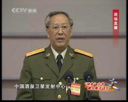 陈炳德:尊敬的胡总书记、温总理,各位领导、各位来宾,同志们,根据航天城的测量结果,我现在郑重宣布,神舟六号载人飞船发射取得圆满成功。